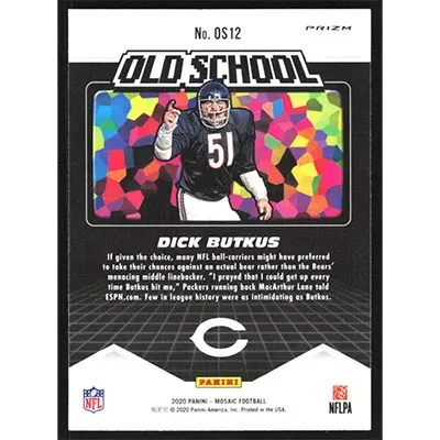 This is a 2020 Panini Mosaic Old School Green Dick Butkus football card. The card is #OS12 and pictures show condition.