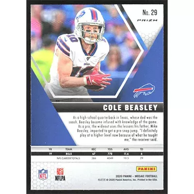 This is a 2020 Panini Mosaic Reactive Blue Cole Beasley football card. The card is #29 and pictures show condition.
