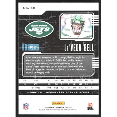 This is a 2020 Panini Playbook Le'Veon Bell football card. The card is #38 and pictures show condition.