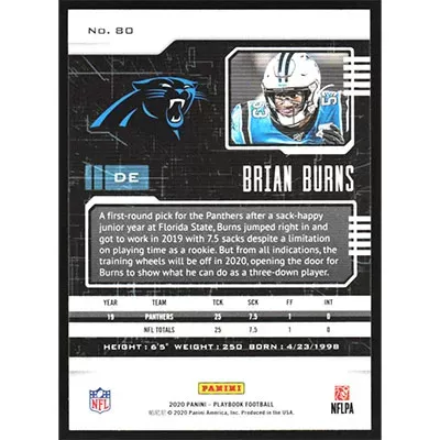 This is a 2020 Panini Playbook Brian Burns football card. The card is #80 and pictures show condition.