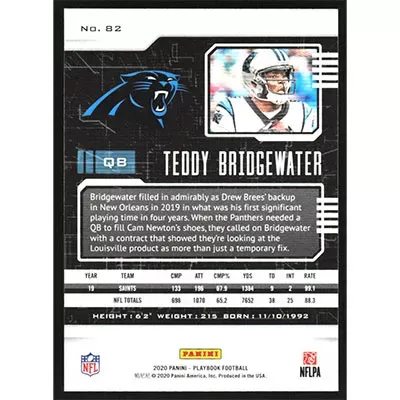 This is a 2020 Panini Playbook Teddy Bridgewater football card. The card is #82 and pictures show condition.