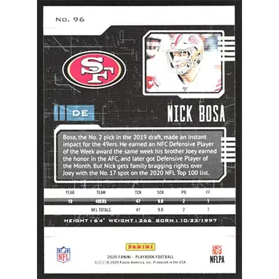 This is a 2020 Panini Playbook Nick Bosa football card. The card is #96 and pictures show condition.