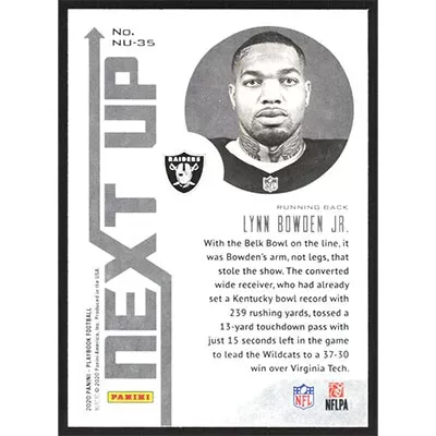 This is a 2020 Panini Playbook Next Up Lynn Bowden Jr. football card. The card is #NU-35 and pictures show condition. Team: Las Vegas Raiders Rookie Card