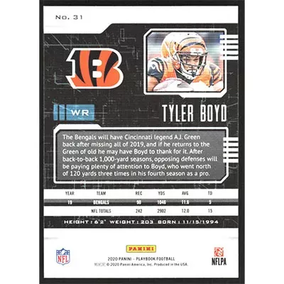 This is a 2020 Panini Playbook Orange Tyler Boyd football card. The card is #31 and pictures show condition.