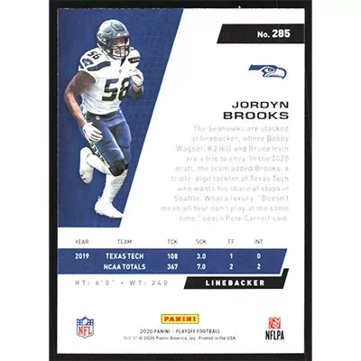 This is a 2020 Panini Playoff Jordyn Brooks football card. The card is #285 and pictures show condition.