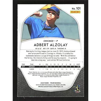 This is a 2020 Panini Prizm Adbert Alzolay baseball card. The card is #101 and pictures show condition.