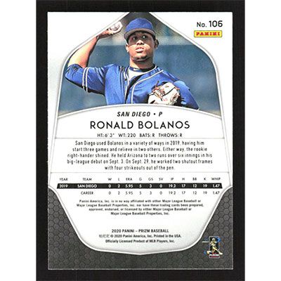 This is a 2020 Panini Prizm Ronald Bolanos baseball card. The card is #106 and pictures show condition.