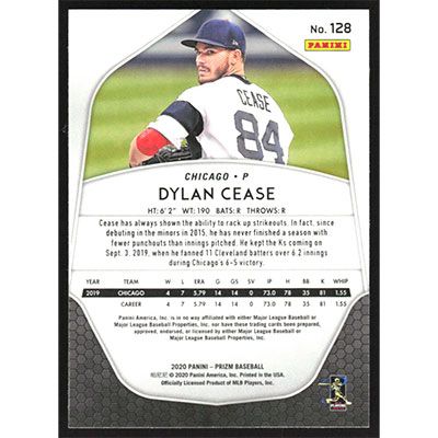 This is a 2020 Panini Prizm Dylan Cease baseball card. The card is #128 and pictures show condition.