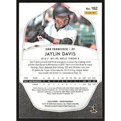 This is a 2020 Panini Prizm Jaylin Davis baseball card. The card is #192 and pictures show condition. Team(s): San Francisco Giants Rookie Card (RC)