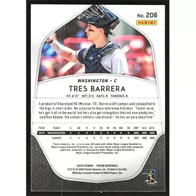 This is a 2020 Panini Prizm Tres Barrera baseball card. The card is #206 and pictures show condition. Team(s): Washington Nationals Rookie Card (RC)