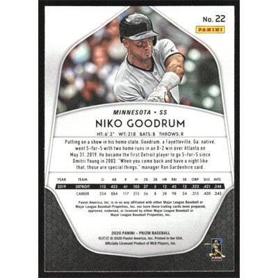 This is a 2020 Panini Prizm Niko Goodrum baseball card. The card is #22 and pictures show condition.