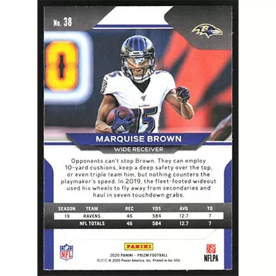 This is a 2020 Panini Prizm Marquise Brown football card. The card is #38 and pictures show condition.