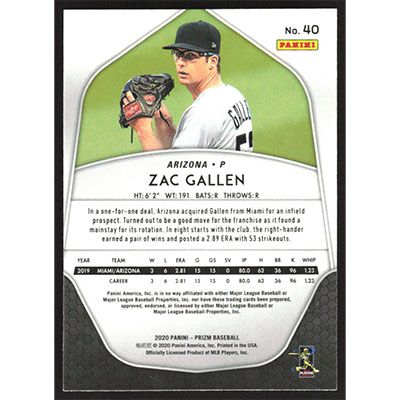 This is a 2020 Panini Prizm Zac Gallen baseball card. The card is #40 and pictures show condition.