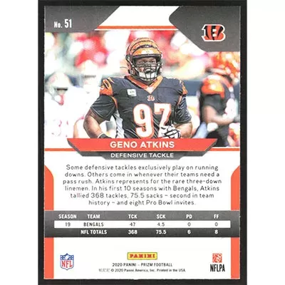 This is a 2020 Panini Prizm Geno Atkins football card. The card is #51 and pictures show condition.