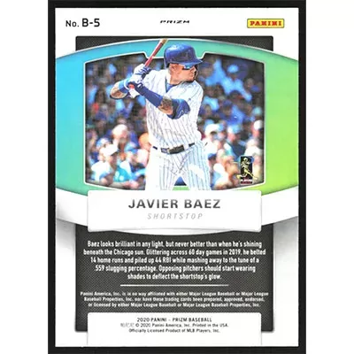 This is a 2020 Panini Prizm Brilliance Cosmic Haze Javier Baez baseball card. The card is #B-5 and pictures show condition.