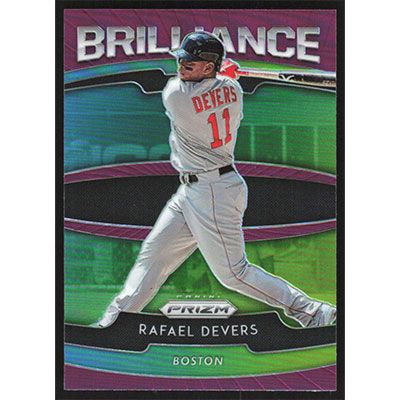 This is a 2020 Panini Prizm Brilliance Purple Rafael Devers baseball card. The card is #B-8 and pictures show condition.