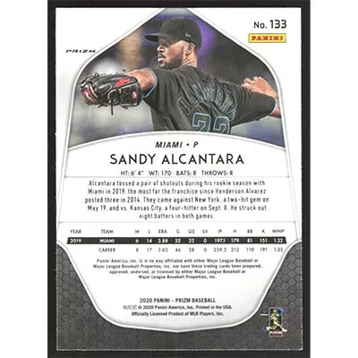 This is a 2020 Panini Prizm Carolina Blue Sandy Alcantara baseball card. The card is #133 and pictures show condition.