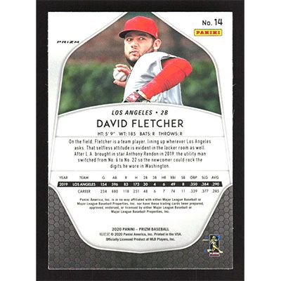 This is a 2020 Panini Prizm Carolina Blue David Fletcher baseball card. The card is #14 and pictures show condition.