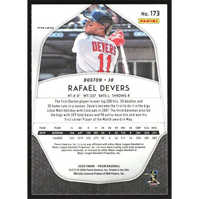 This is a 2020 Panini Prizm Carolina Blue Rafael Devers baseball card. The card is #173 and pictures show condition.