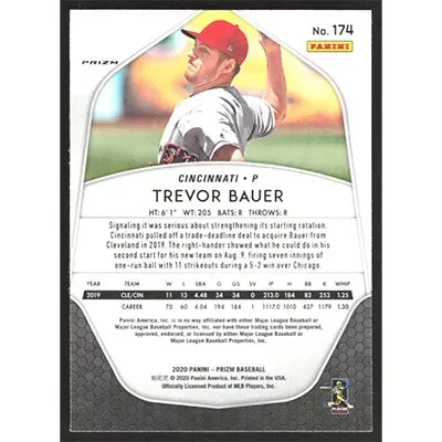 This is a 2020 Panini Prizm Carolina Blue Trevor Bauer baseball card. The card is #174 and pictures show condition.