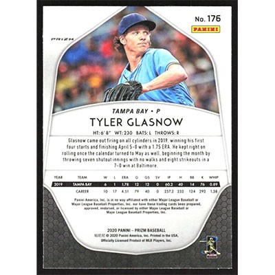This is a 2020 Panini Prizm Carolina Blue Tyler Glasnow baseball card. The card is #176 and pictures show condition.