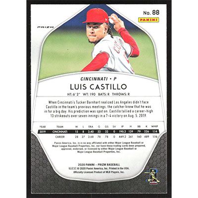 This is a 2020 Panini Prizm Carolina Blue Luis Castillo baseball card. The card is #88 and pictures show condition.