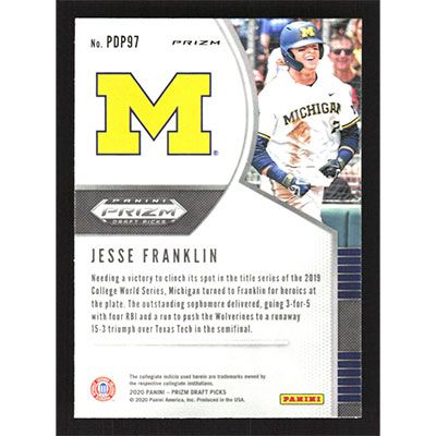 This is a 2020 Panini Prizm Draft Picks Blue and Carolina Blue Hyper Jesse Franklin baseball card. The card is #PDP97 and pictures show condition. Team(s): Michigan Wolverines