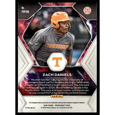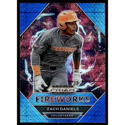 This is a 2020 Panini Prizm Draft Picks Fireworks Blue and Carolina Blue Hyper Zach Daniels baseball card. The card is #PDP180 and pictures show condition.