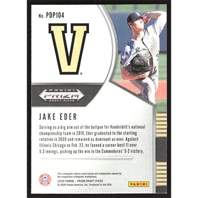 This is a 2020 Panini Prizm Draft Picks Jake Eder baseball card. The card is #PDP104 and pictures show condition.
