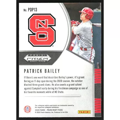 This is a 2020 Panini Prizm Draft Picks Patrick Bailey baseball card. The card is #PDP13 and pictures show condition.