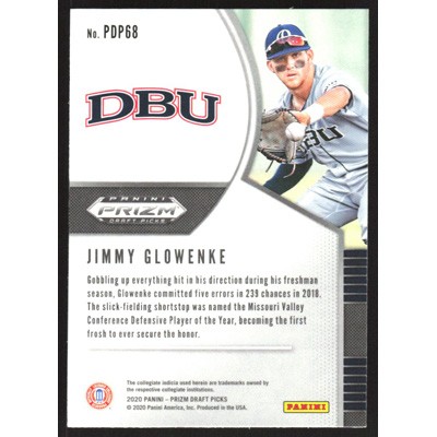 This is a 2020 Panini Prizm Draft Picks Jimmy Glowenke baseball card. The card is #PDP68 and pictures show condition. Team(s): Dallas Baptist Patriots