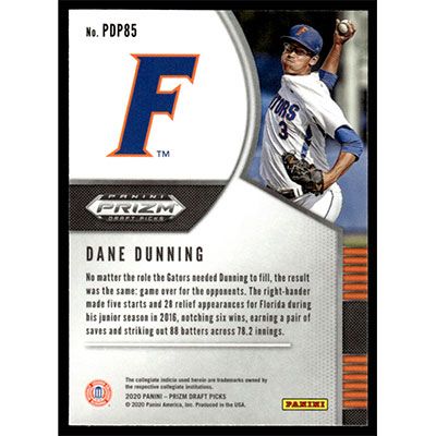 This is a 2020 Panini Prizm Draft Picks Dane Dunning baseball card. The card is #PDP85 and pictures show condition.