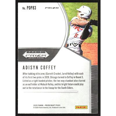 This is a 2020 Panini Prizm Draft Picks Silver Adisyn Coffey baseball card. The card is #PDP83 and pictures show condition.