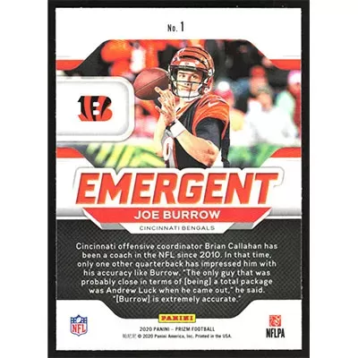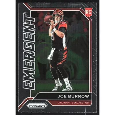 This is a 2020 Panini Prizm Emergent Joe Burrow football card. The card is #1 and pictures show condition. Team(s): Cincinnati Bengals Rookie Card (RC)