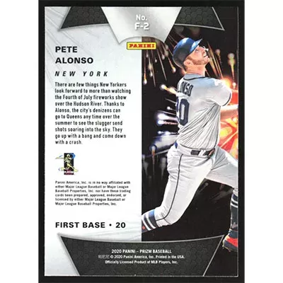 This is a 2020 Panini Prizm Fireworks Pete Alonso baseball card. The card is #F-2 and pictures show condition.
