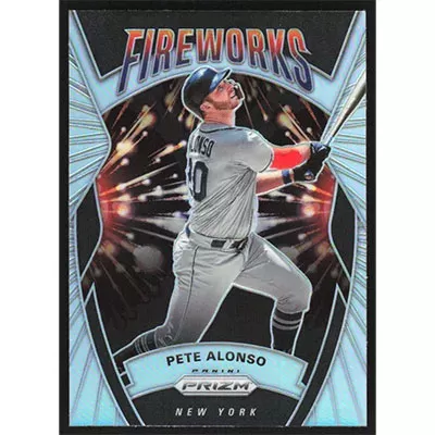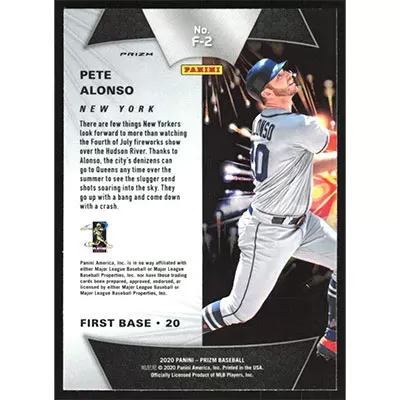 This is a 2020 Panini Prizm Fireworks Silver Pete Alonso baseball card. The card is #F-2 and pictures show condition.