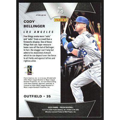 This is a 2020 Panini Prizm Fireworks Silver Cody Bellinger baseball card. The card is #F-5 and pictures show condition.
