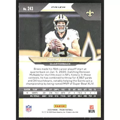 This is a 2020 Panini Prizm Green Drew Brees football card. The card is #243 and pictures show condition.
