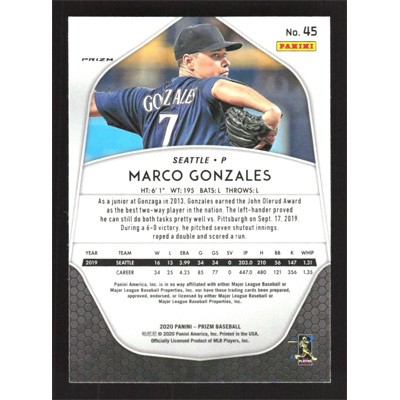 This is a 2020 Panini Prizm Green Marco Gonzales baseball card. The card is #45 and pictures show condition.