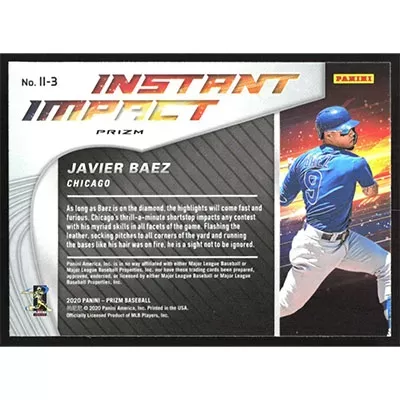 This is a 2020 Panini Prizm Instant Impact Silver Javier Baez baseball card. The card is #II-3 and pictures show condition.
