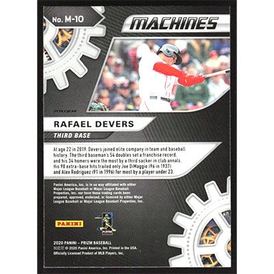 This is a 2020 Panini Prizm Machines Silver Rafael Devers baseball card. The card is #M-10 and pictures show condition.