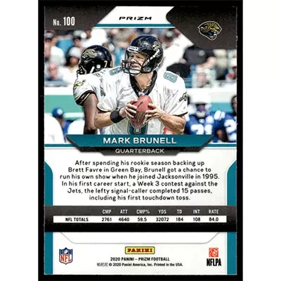 This is a 2020 Panini Prizm Neon Green Pulsar Mark Brunell football card. The card is #100 and pictures show condition.