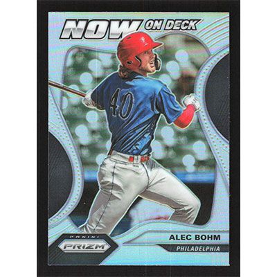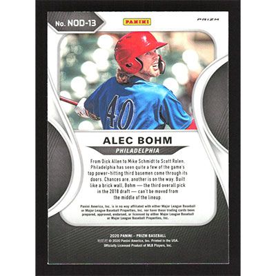 This is a 2020 Panini Prizm Now On Deck Silver Alec Bohm baseball card. The card is #NOD-13 and pictures show condition.