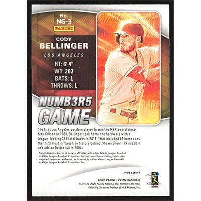 This is a 2020 Panini Prizm Numbers Game Red White and Blue Cody Bellinger baseball card. The card is #NG-3 and pictures show condition. Team(s): Los Angeles Dodgers
