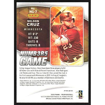 This is a 2020 Panini Prizm Numbers Game White Wave Nelson Cruz baseball card. The card is #NG-7 and pictures show condition.