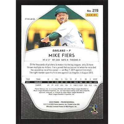 This is a 2020 Panini Prizm Pink Mike Fiers baseball card. The card is #219 and pictures show condition.