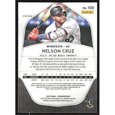 This is a 2020 Panini Prizm Purple Nelson Cruz baseball card. The card is #103 and pictures show condition.
