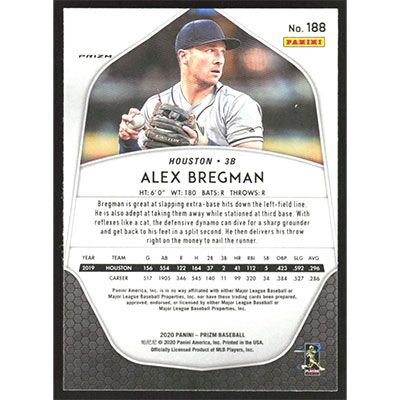 This is a 2020 Panini Prizm Purple Alex Bregman baseball card. The card is #188 and pictures show condition.