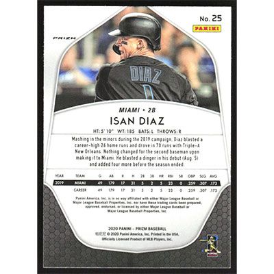 This is a 2020 Panini Prizm Purple Isan Diaz baseball card. The card is #25 and pictures show condition.