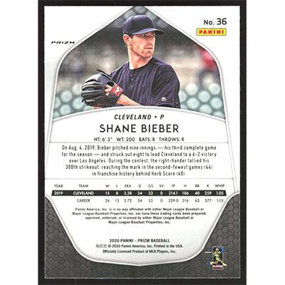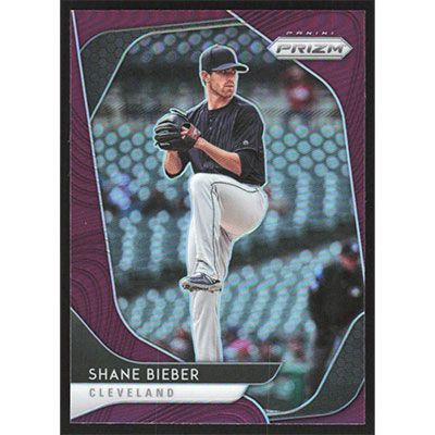 This is a 2020 Panini Prizm Purple Shane Bieber baseball card. The card is #36 and pictures show condition.